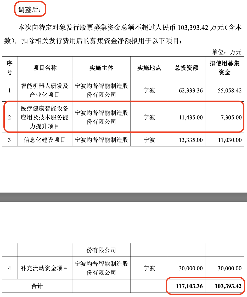 部分募投项目名称、实施主体、地点、投资额及拟用募资有变动,如“医疗健康智能设备应用及技术服务全球能力提升项目”变为“医疗健康智能设备应用及技术服务能力提升项目”,实施地点从德国、宁波变为宁波,总投资额从2.64亿元降至1.14亿元。
