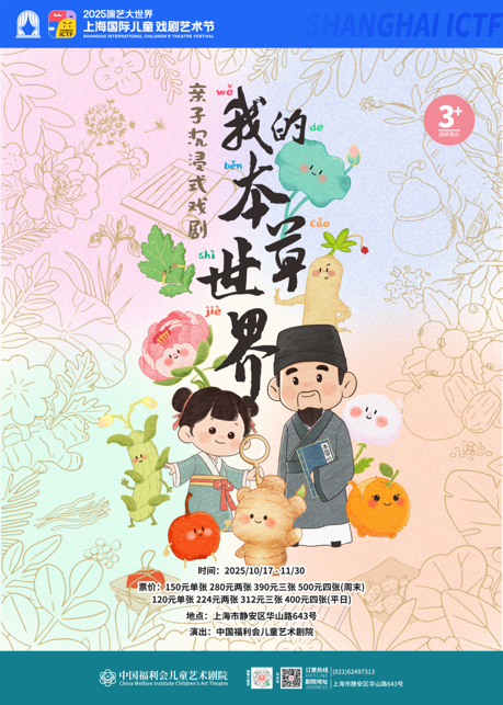作为艺术节的重点项目,“我的本草世界”——亲子沉浸式戏剧体验,将于10月17日-11月30日在中福会儿童艺术剧院展出,以传承中华中医药文化为核心,运用实景交互数字技术,匠心打造一个沉浸式、可互动、可探索的“本草精灵世界”。“每一株草都是一个故事,每一味药都是一段传奇。”华山路643号的百年洋房将被装扮成明代药堂,孩子们将在“马兰花本草精灵”的引导下,开启一场寻找传奇药方的奇妙冒险,感受传统医药文化在科技赋能下焕发的全新魅力。2条游玩线路、5大主题空间、30多位演职人员、近百种本草植物,孩子们化身“小药童”,跟随药铺学徒穿越四季寻草识方,更有神秘NPC提供线索,一起找回《本草纲目》的智慧碎片,触摸千年本草的生命密码。上海儿童艺术剧场也将在11月1日-2日开启“我的欢乐农场”亲子主题集市,为家庭提供戏剧教育与生态美育相结合的一站式新奇体验。